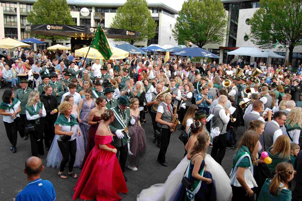 Am Sonntag hatten wir es wieder, das schöne Schützenfestwetter. Und was ab mittags vor dem Sennestadthaus und auf dem Reichowplatz abging, war ein ganz toller Schützenfesttag. Dieses Jahr begannen wir mit dem großen Zapfenstreich, vorgetragen vom Bläserchor Nordborchen und dem Spielmannszug der Schützenbruderschaft Stukenbrock. Vor dem Sennestadthaus, umgeben von unserem Bataillon, den befreundeten Vereinen, den Ehrengästen und den weiteren Kapellen, war der Zapfenstreich für die vielen Gäste und Zuschauer ein beeindruckendes Erlebnis. Nach der Ehrung der Majestäten begann der traditionelle Festumzug durch Sennestadt. Währenddessen sorgten die „Black Sun Linedancer“ auf dem Reichowplatz für schwungvolle Unterhaltung. Der Reichowplatz verwandelte sich in ein kleines Volksfest – mit Karussell, Schießbude, Losverkauf und diversen Essens- und Getränkeständen – Groß und Klein waren begeistert.